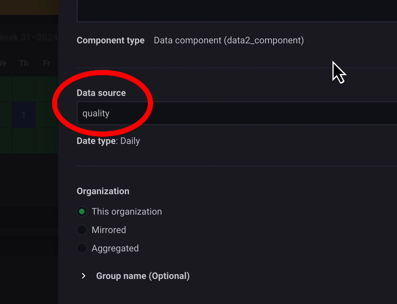 Och om vi kikar under inställningar på en komponent så kan vi se att alla komponenter är kopplade till något vi kallar en datakälla.