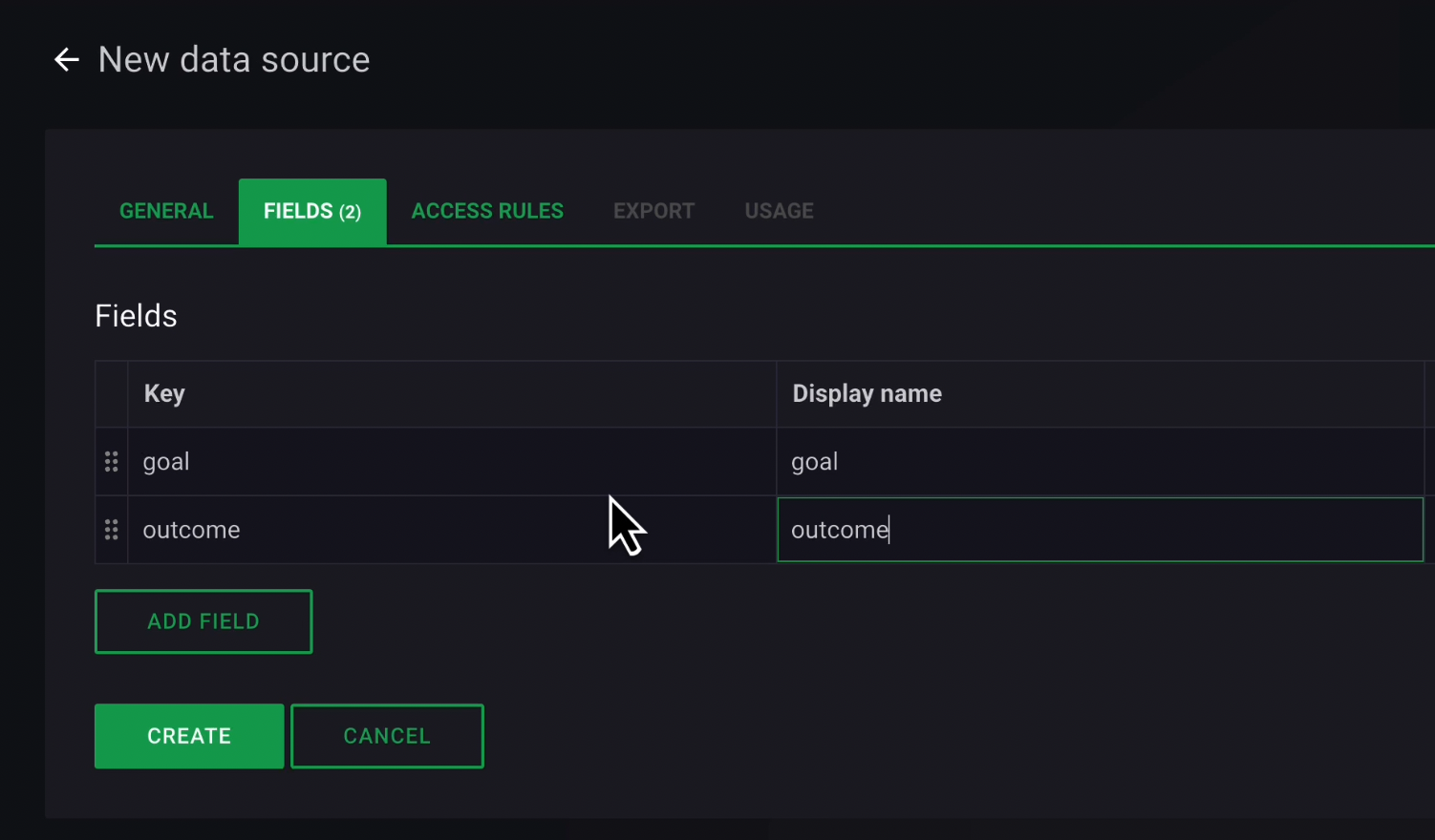 I det här fallet heter den Quality. Det är i datakällan som all data lagras oavsett om den matas in manuellt i Boards on Fire eller hämtas in från något annat system. När man skapar en ny datakälla sätter man ett namn på den och skapar ett eller flera fält för data som ska hanteras.