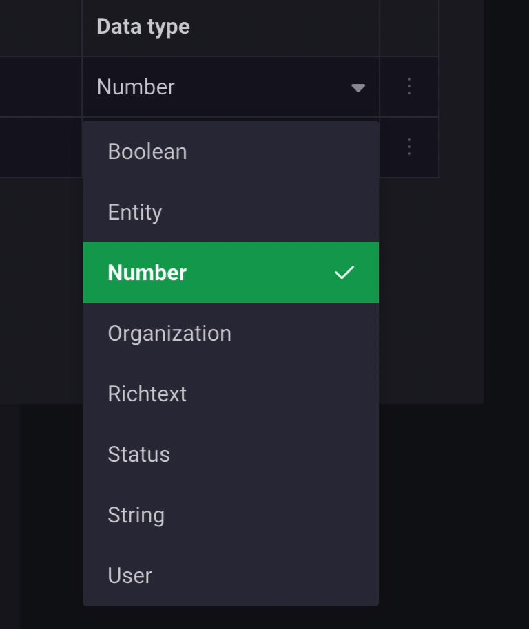 I det här fallet är det två fält - mål och utfall - som båda är av datatypen nummer. Men vi stöder även en rad andra datatyper, vilket gör att vi kan bygga upp datamodellen i Boards on Fire utifrån hur den ser ut i ert affärssystem eller andra system ni vill hämta data ifrån.