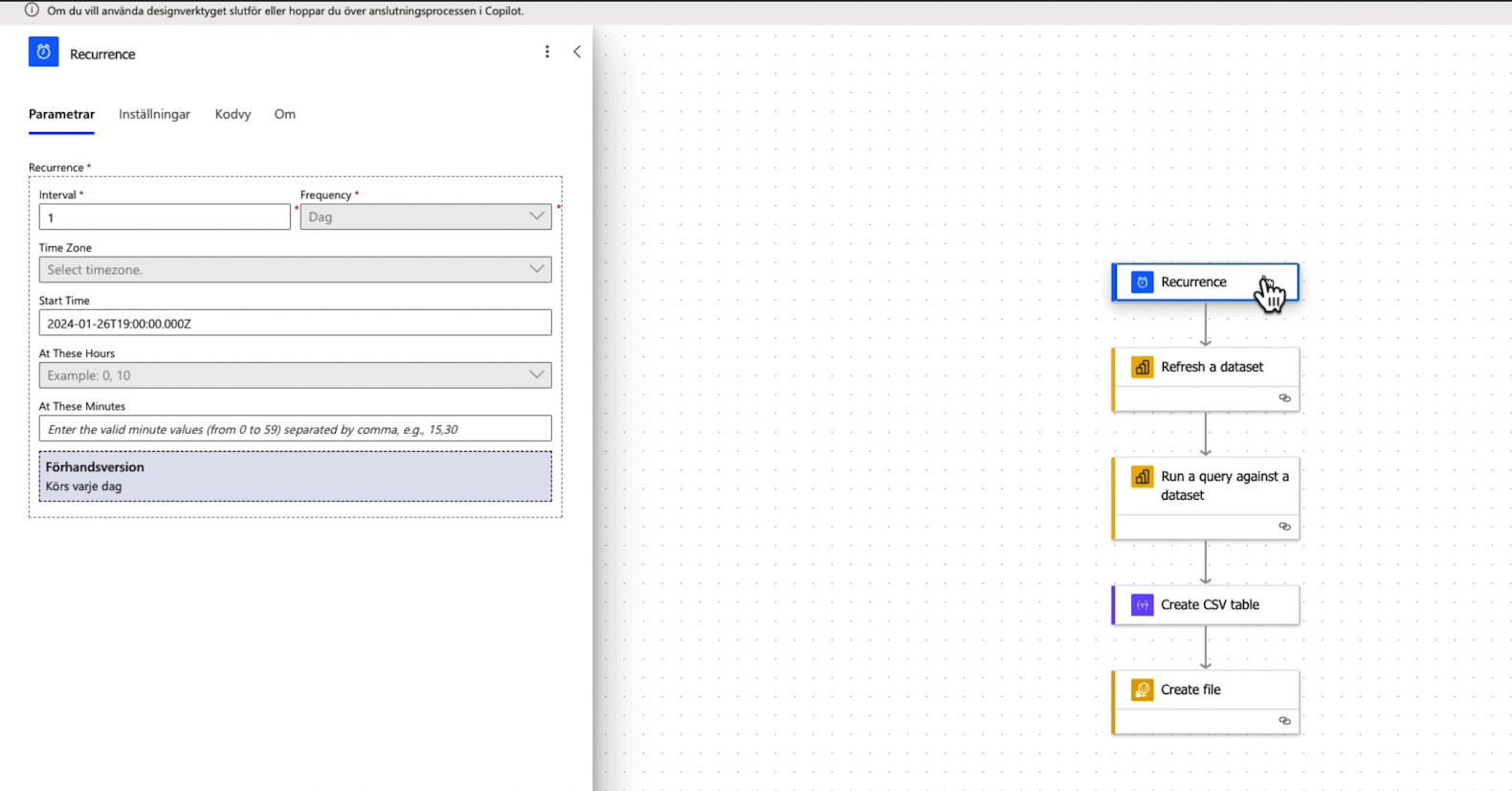 Vid angivet tidsintervall – i det här fallet varje dag – ska datasetet hämtas från Power BI-rapporten och refreshas för att se till att det är de senast uppdaterade siffrorna som kommer med. Därefter ställs en fråga mot datasetet – det skapas en csv-tabell och den csv-tabellen skickas via SFTP till vår SFTP-server där den lagras.