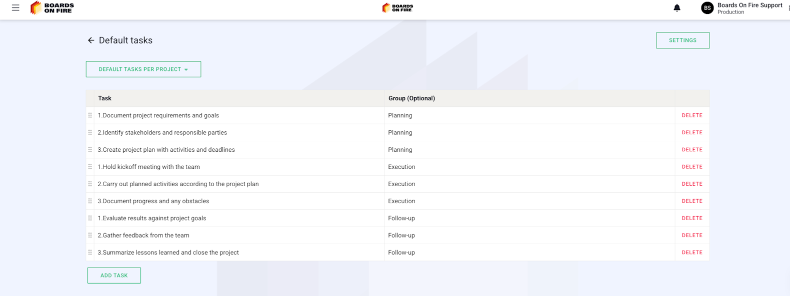 -Click “Add task” for each default task you want to create. You can group tasks to keep them organized by category (optional). Drag the tasks to the desired order directly in the list. To remove a task that is no longer needed, click “Delete” to the right of the task.