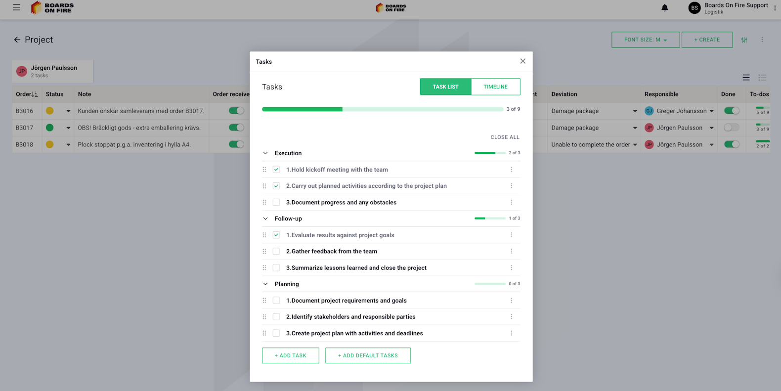 Default tasks is a function in Boards on Fire that makes it easy to quickly and consistently create recurring tasks. These can, for example, be tasks linked to improvement work, deviations, or daily routines.