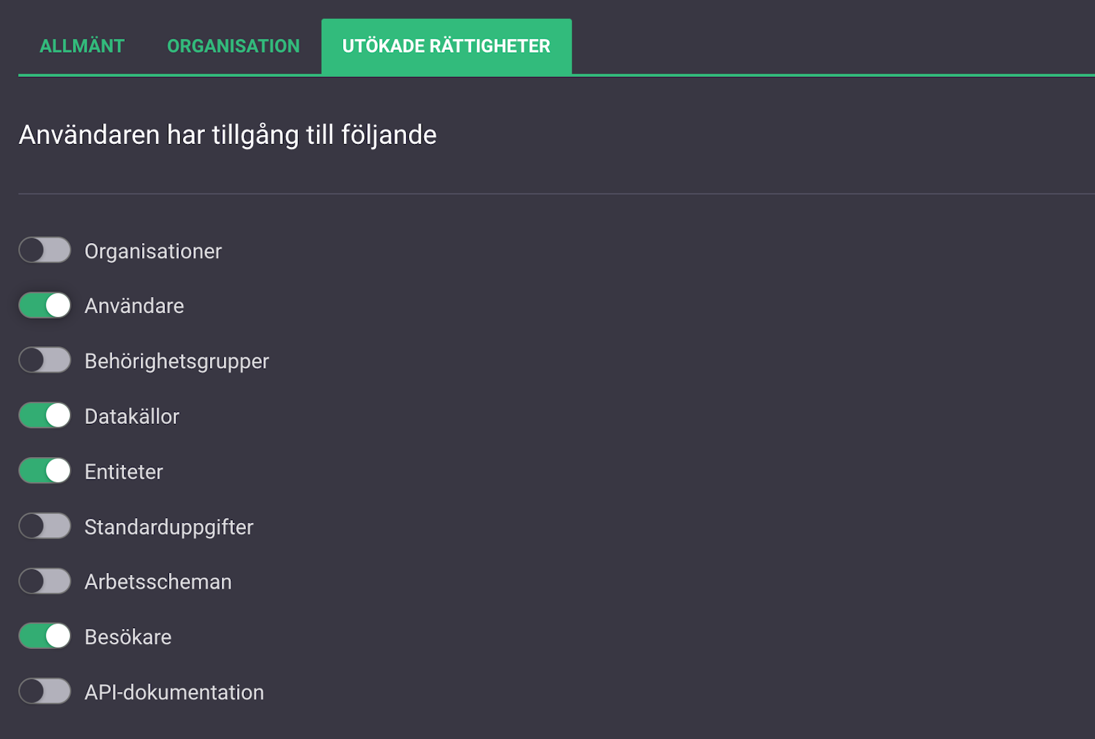 Nu går det att sätta specifik adminbehörighet på användare i BoF. Gå till Användare under admingränssnittet, välj vilken användare det gäller och klicka på utökade rättigheter. Här kan du markera vilken/vilka typer av utökad behörighet du vill ge användaren som sedan får tillgång till specifikt den kategorin i admingränssnittet.