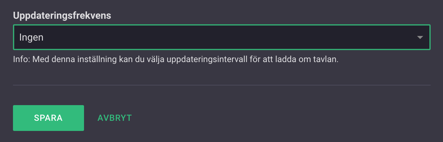 Nu kan du ute i huvudmenyn sätta en uppdateringsfrekvens på dina tavlor. Gå in på tavlans inställningar och scrolla längst ner. Det går att sätta intervallet mellan 1-12h, eller standardvärdet ”ingen”. Tavlan kommer att uppdateras enligt ditt bestämda intervall med en förvarning på 15 sekunder som ger dig en chans att avbryta uppdateringen om du för tillfället arbetar i tavlan. (Intervalltiden skjuts fram när du på egen anledning uppdaterad tavlan, t.ex. genom att gå ut och in i tavlan igen)