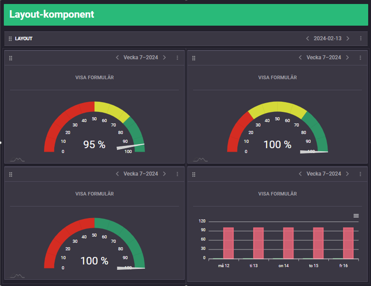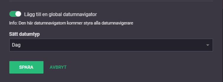 Nu finns det en global datumnavigator tillgänglig för att kunna specificera eller bläddra mellan olika datumintervall på alla komponenterna i en tavla samtidigt. Detta gör det möjligt att snabbt och enkelt se din historik utan att behöva backa manuellt i varje komponent. Datumnavigatorn fungerar oberoende av vilken precision din komponent använder – dag, vecka, månad.