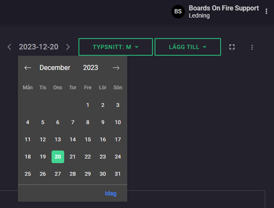 Väl inne i tavlan så hamnar navigatorn bredvid typsnittsknappen i toppen av tavlan. Det datumintervall du väljer här kommer direkt att slå över på alla komponenter. Har du valt veckovis, så kommer en datakälla med dagsprecision visa måndag, och har du valt månadsvis kommer en datakälla med veckoprecision visa första veckan den månaden.