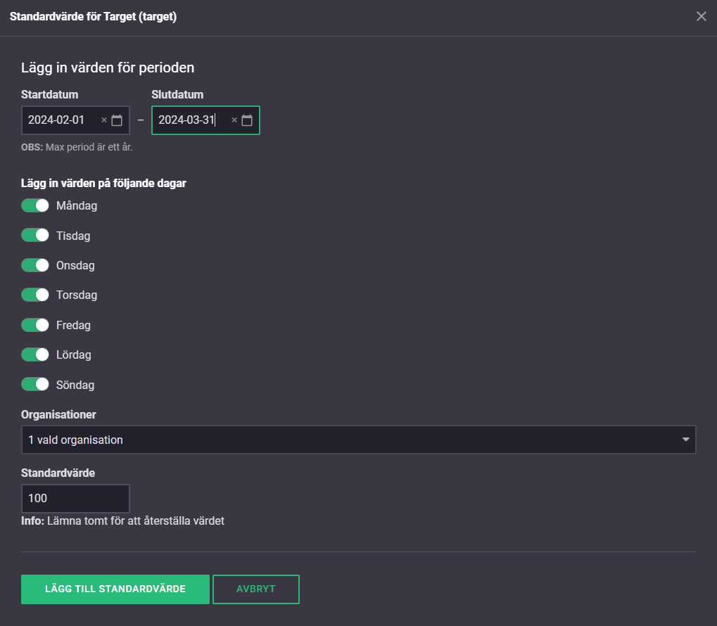 Bestäm en tidsperiod och mellan vilka dagar samt för vilka organisationer det bestämda värdet skall sparas.