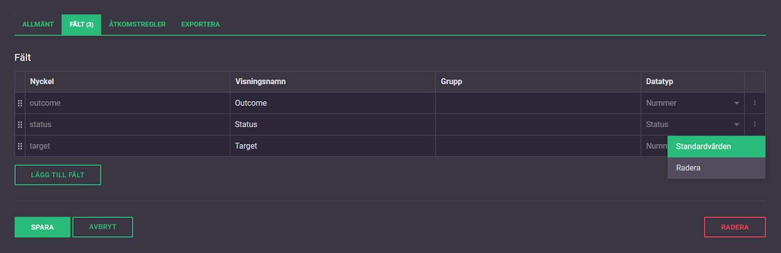 Den nya funktionen för standardvärden finns i din specifika datakälla (alltså endast tillgängligt för administratörer med behörighet att skapa och ändra i datakällor). Gå till fliken "Fält", välj ett fält och gå till standardvärden.