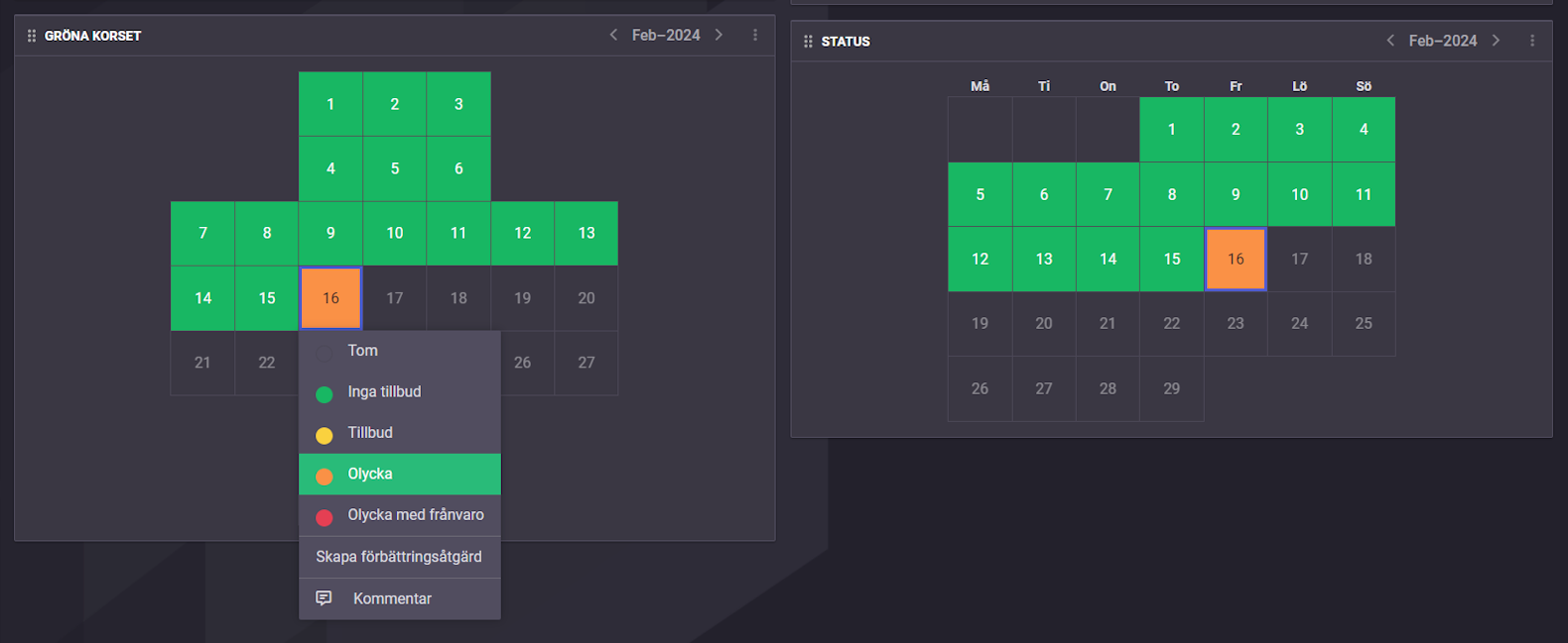 Nu finns Orange status tillgängligt i både Gröna Korset och Status-komponenten. Den har värde 35, och hamnar mellan Gul (30) och Röd (40) färg. Den är tänkt att användas i Gröna Korset som ”Olycka” då röd flyttat till ”Olycka med frånvaro”, men huruvida ni vill applicera den eller ej bestämmer ni själva via inställningarna på komponentnivå.
