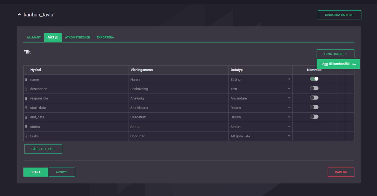 För att skapa en Kanbantavla behöver du lägga till två fält till din entitet: Position och Kanban-fält.