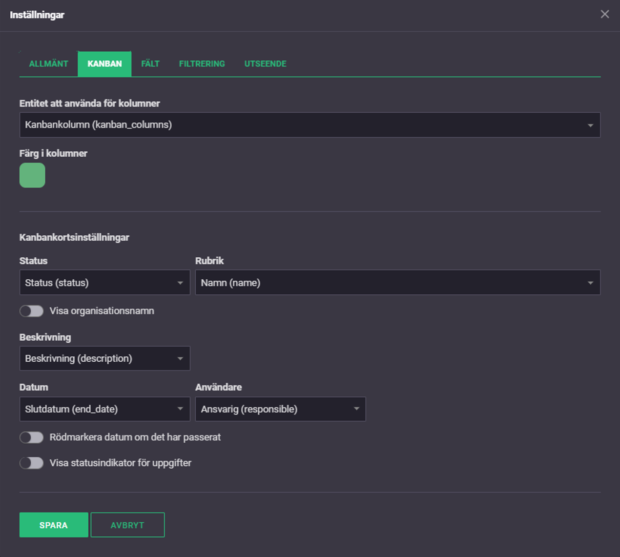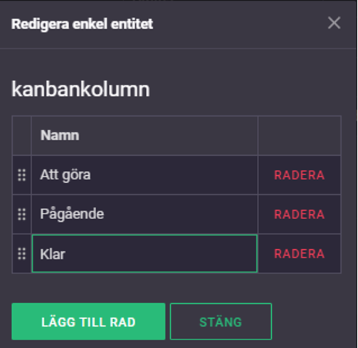 Två nya fält skapas; ”Position” definierar vilken plats i sorteringsordningen Kanban-korten skall ha gentemot varandra (kortens visningsordning). ”Kanbankolumn” är en enkel entitet där du bestämmer hur de olika kolumnrubrikerna skall namnges. Ett exempel på vad de kan heta: ”Att göra”, ”Pågående”, ”Klara”.