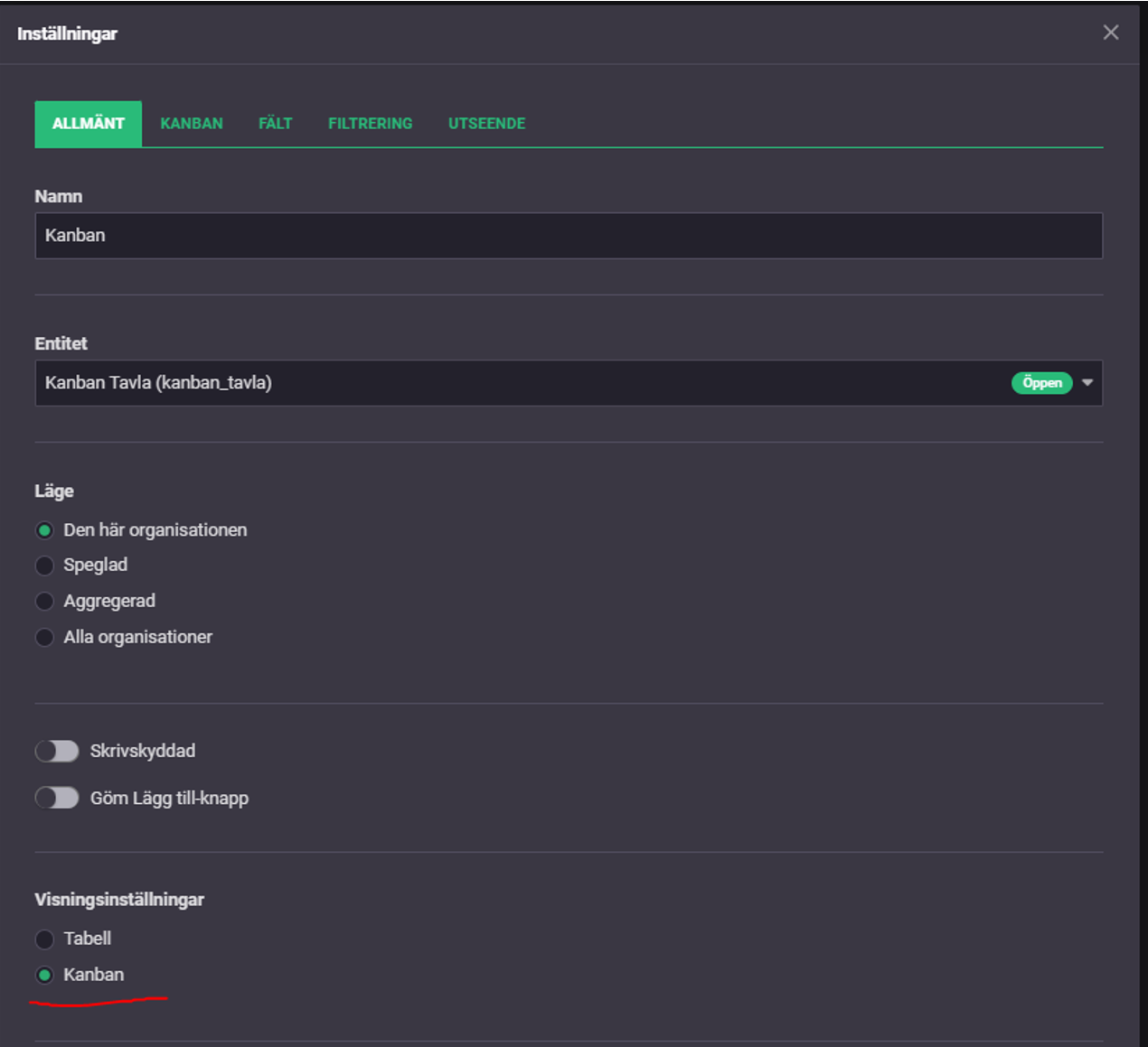 Väl inne i en aktivitetstavla så kan du nu se valet ”Kanban” under Visningsinställningar.