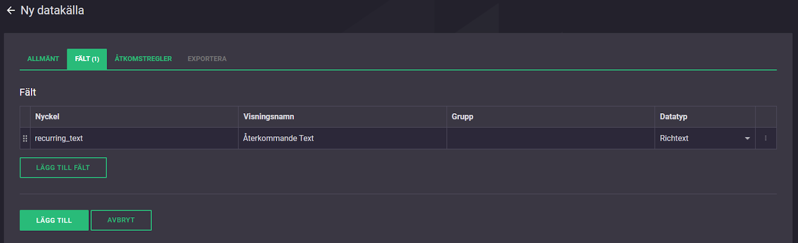 Den här komponenten är i dagsläget ganska enkel. Det är en precisionsbaserad fritext, vilket innebär att den är återkommande dagsvis/veckovis/månadsvis beroende på hur den skapas. Du kan skapa ett nytt fält i en befintlig datakälla, eller skapa en helt ny likt nedan: