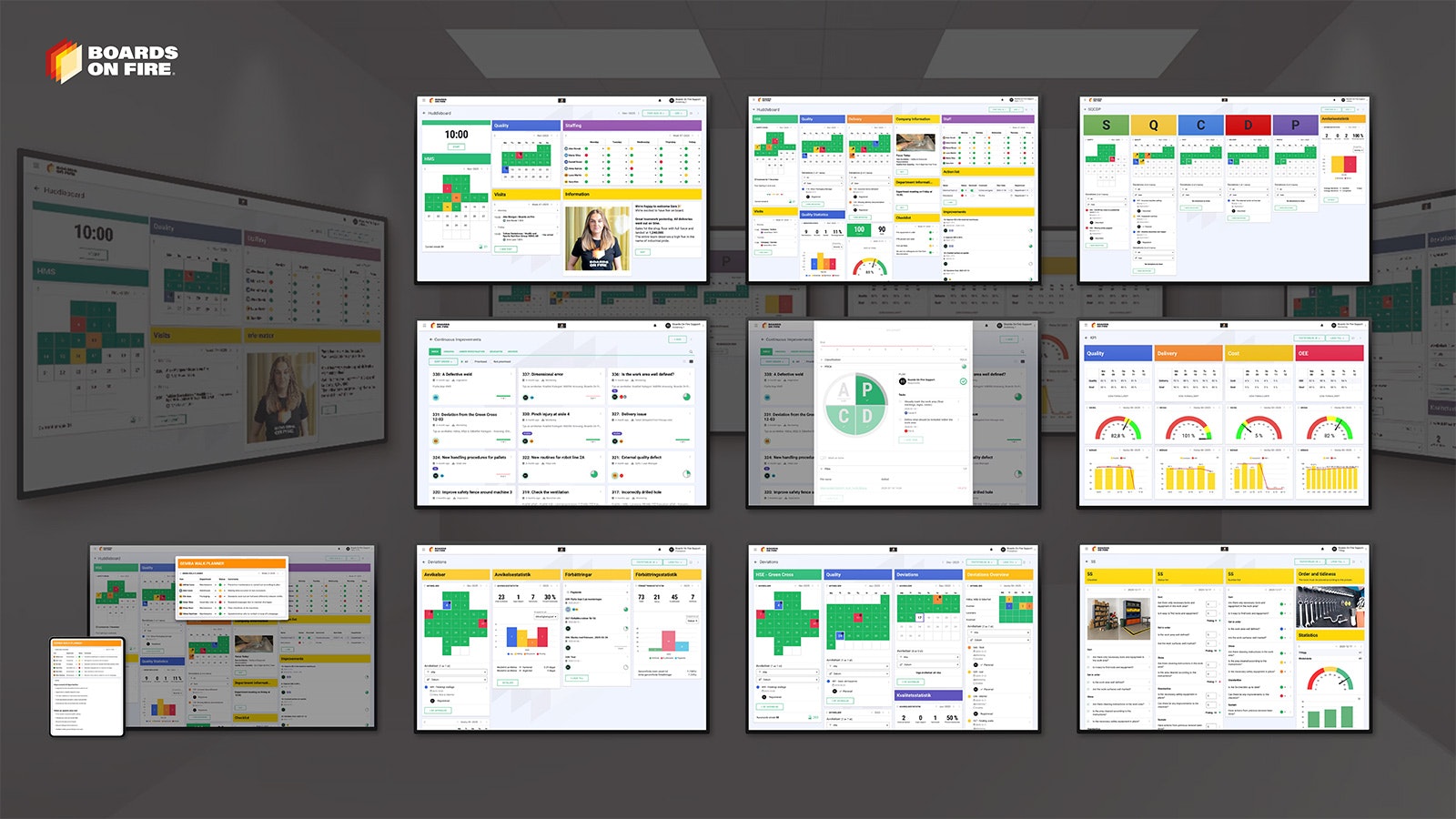 Boards on Fires digitala verktyg för daglig styrning erbjuder flera typer av pulstavlor som kan anpassas efter olika behov, roller och arbetssätt i organisationen. Tavlorna stödjer allt från förbättringsarbete och avvikelsehantering till uppföljning av KPI:er och mycket mer. Respektive tavla har sin specifika funktion, men när de används tillsammans förstärks effekten och skapar betydande värde för hela verksamheten.
