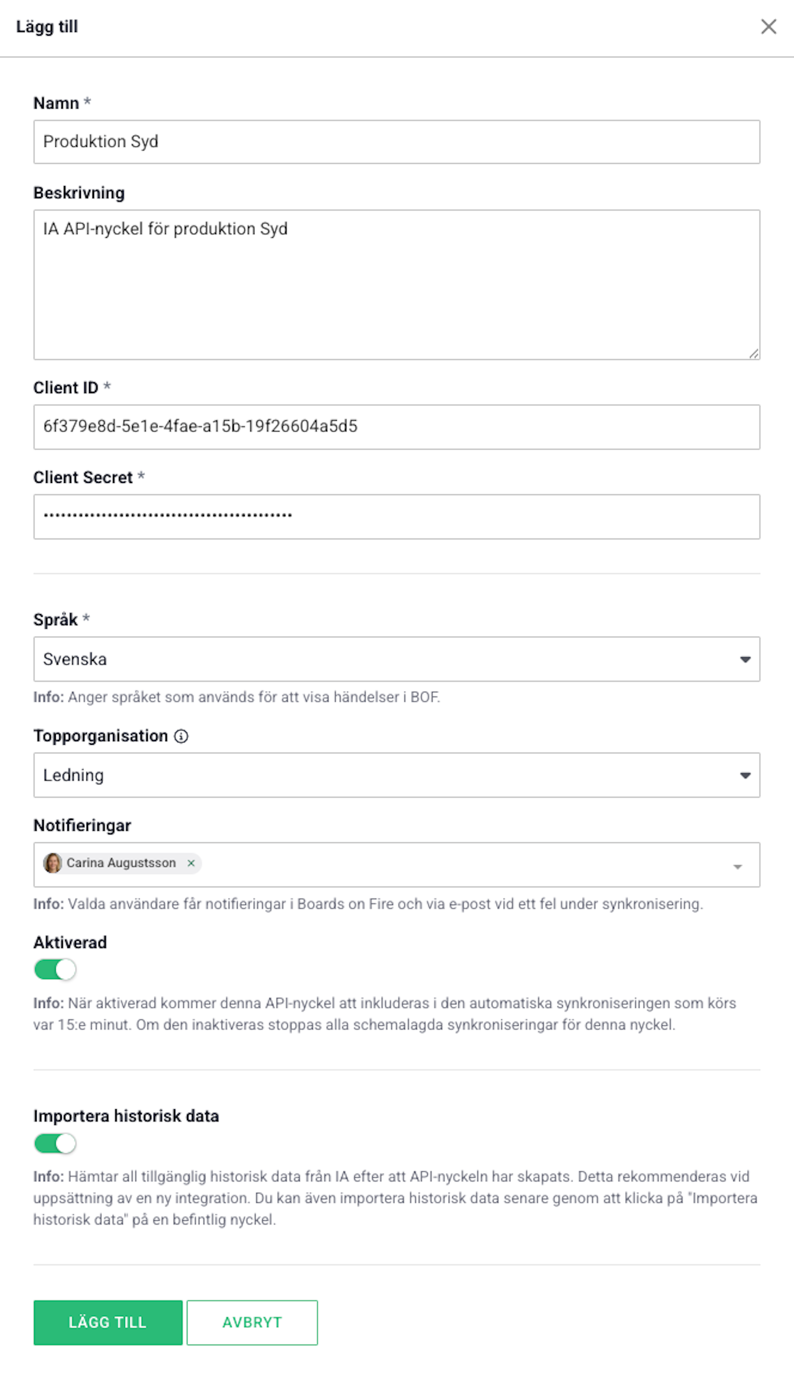 Vi hämtar ingen personlig information eller annan känslig data från IA-systemet. Den information som tas in i Boards on Fire är begränsad till: